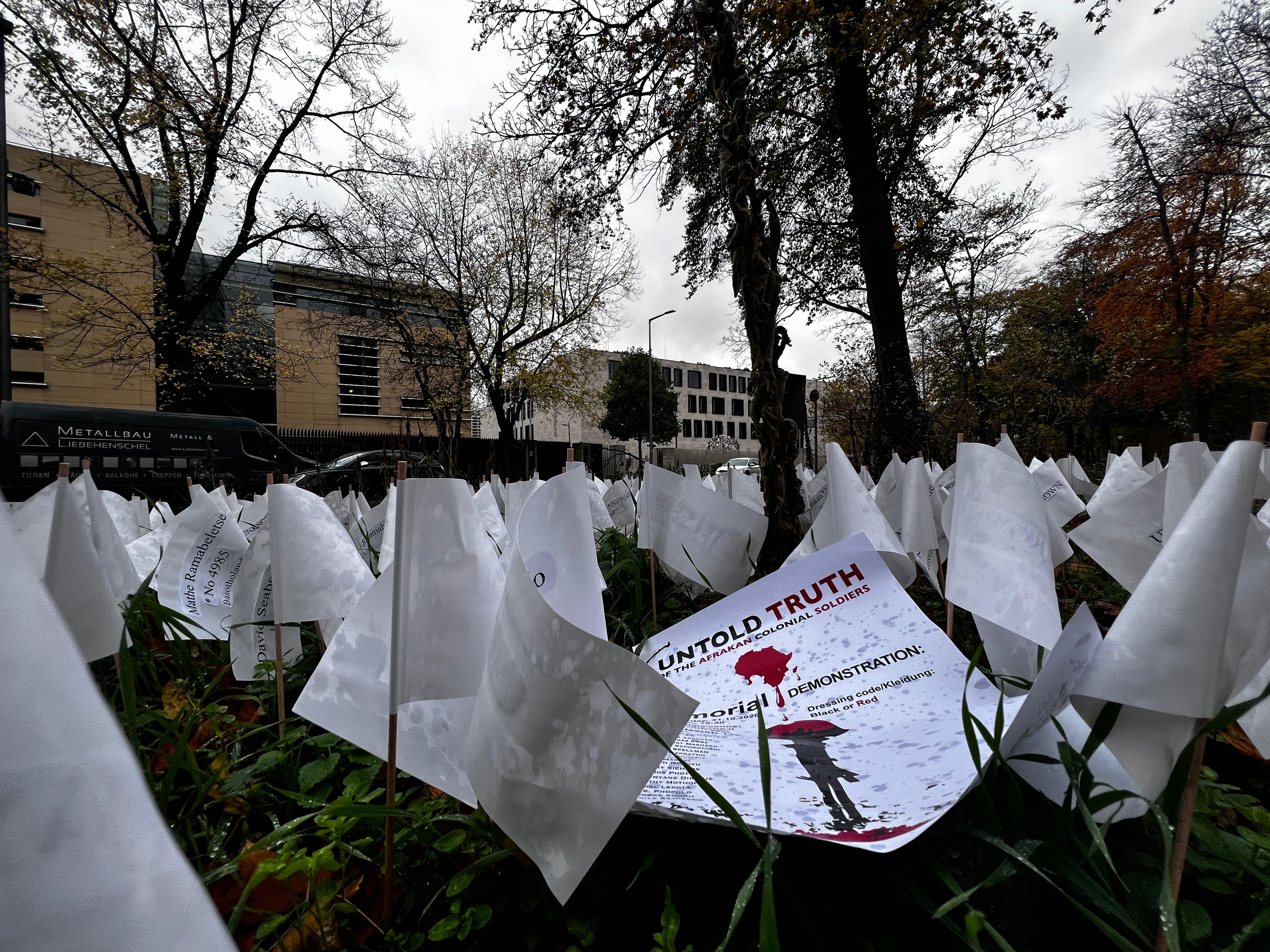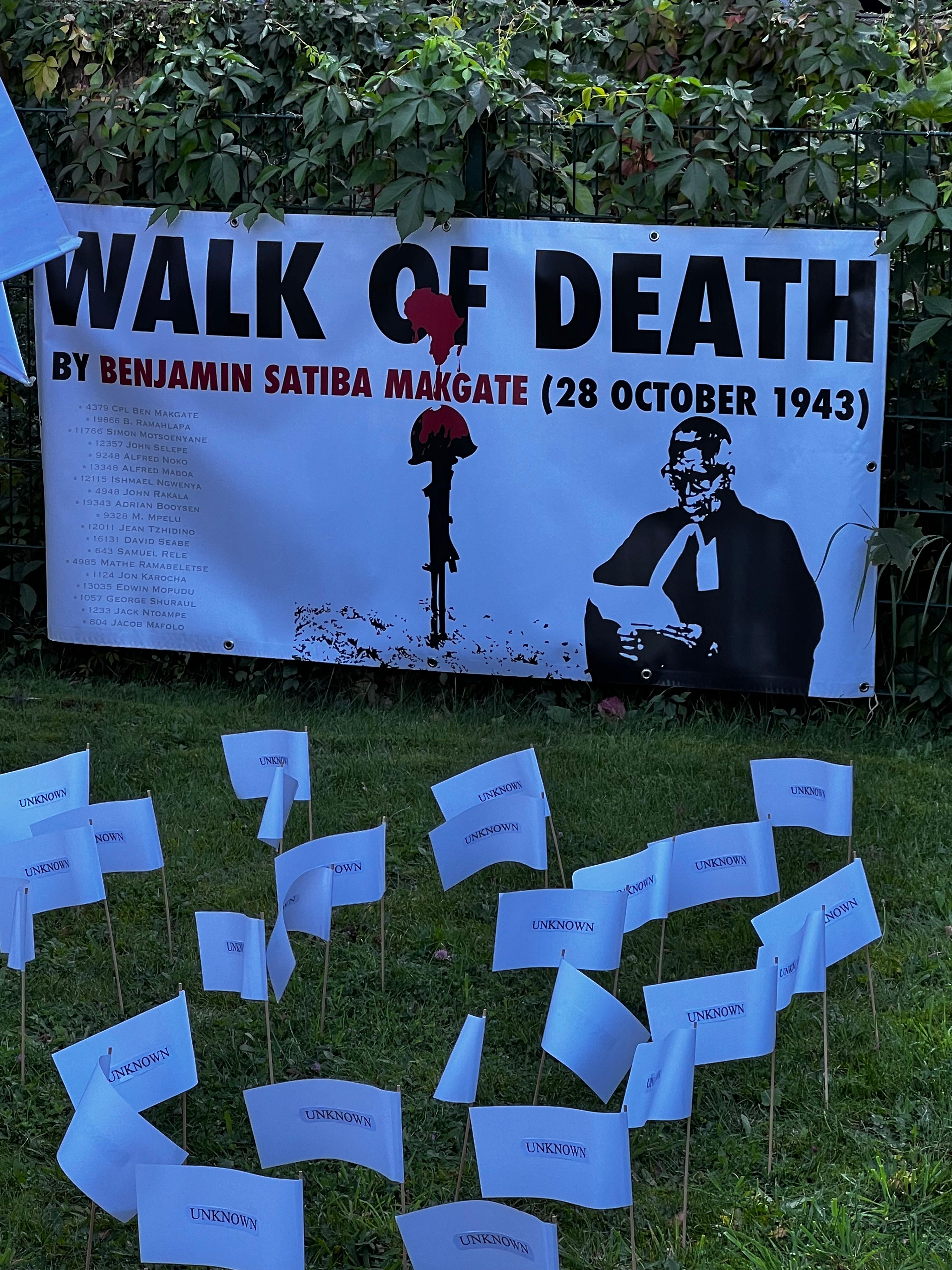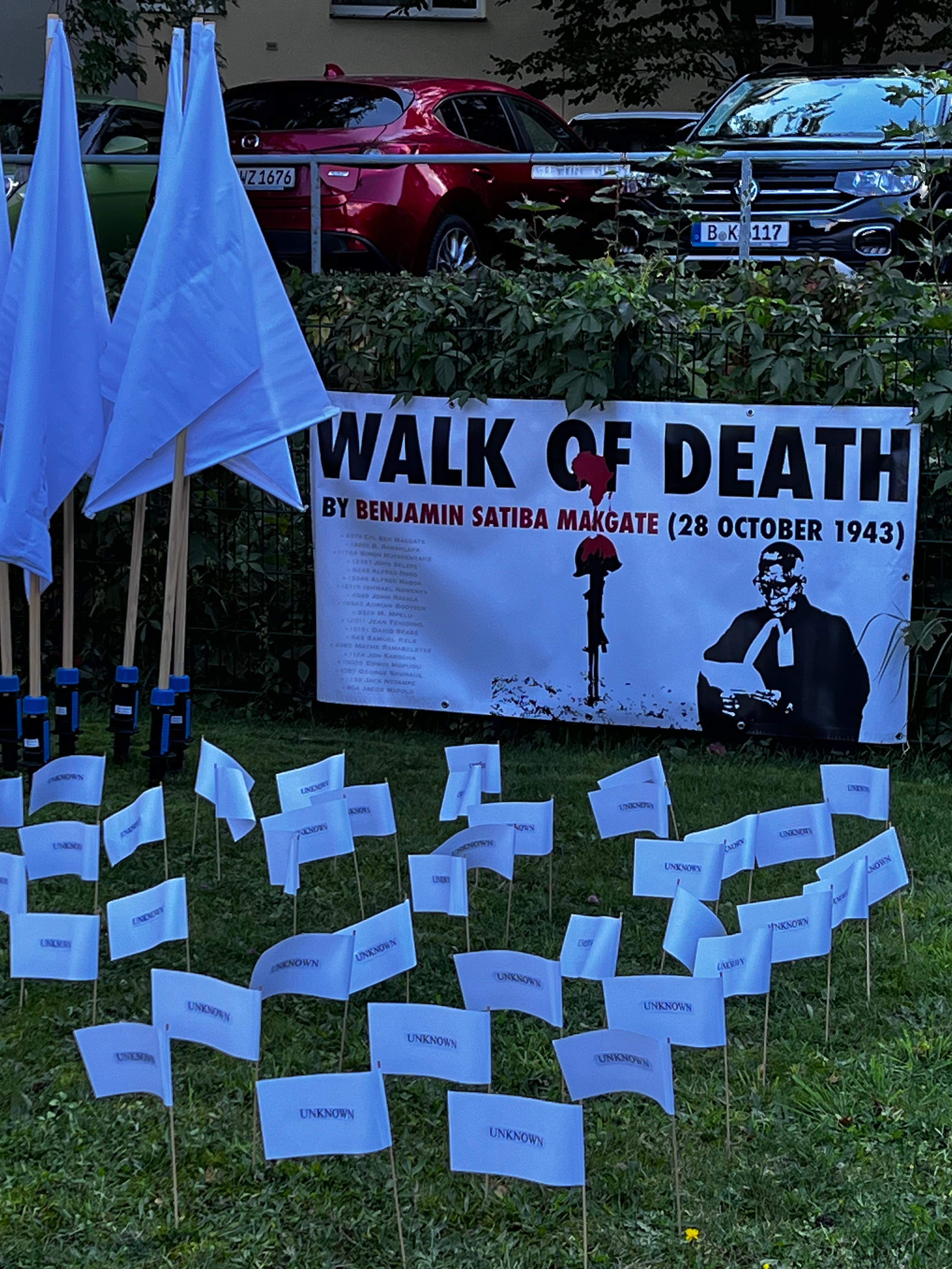 The 3rd year was the "Monumental Lengthy Memorials" on October 2022(24th−28th). .We displayed white flags at different location (South African,British, French & Italian Embassies, and the German Parliament Berlin) as a symbol of repatriating our forefather's souls to Afraka.