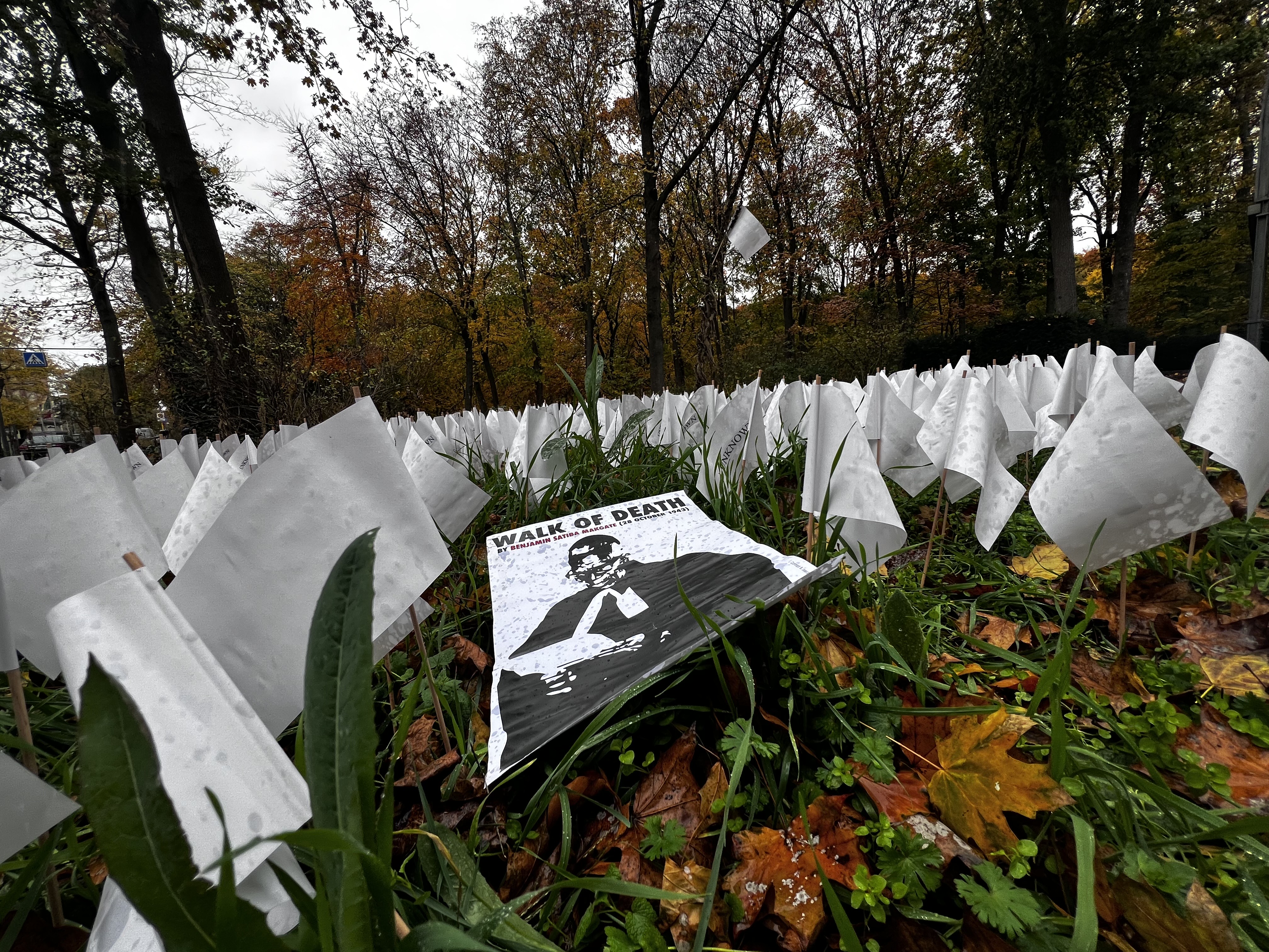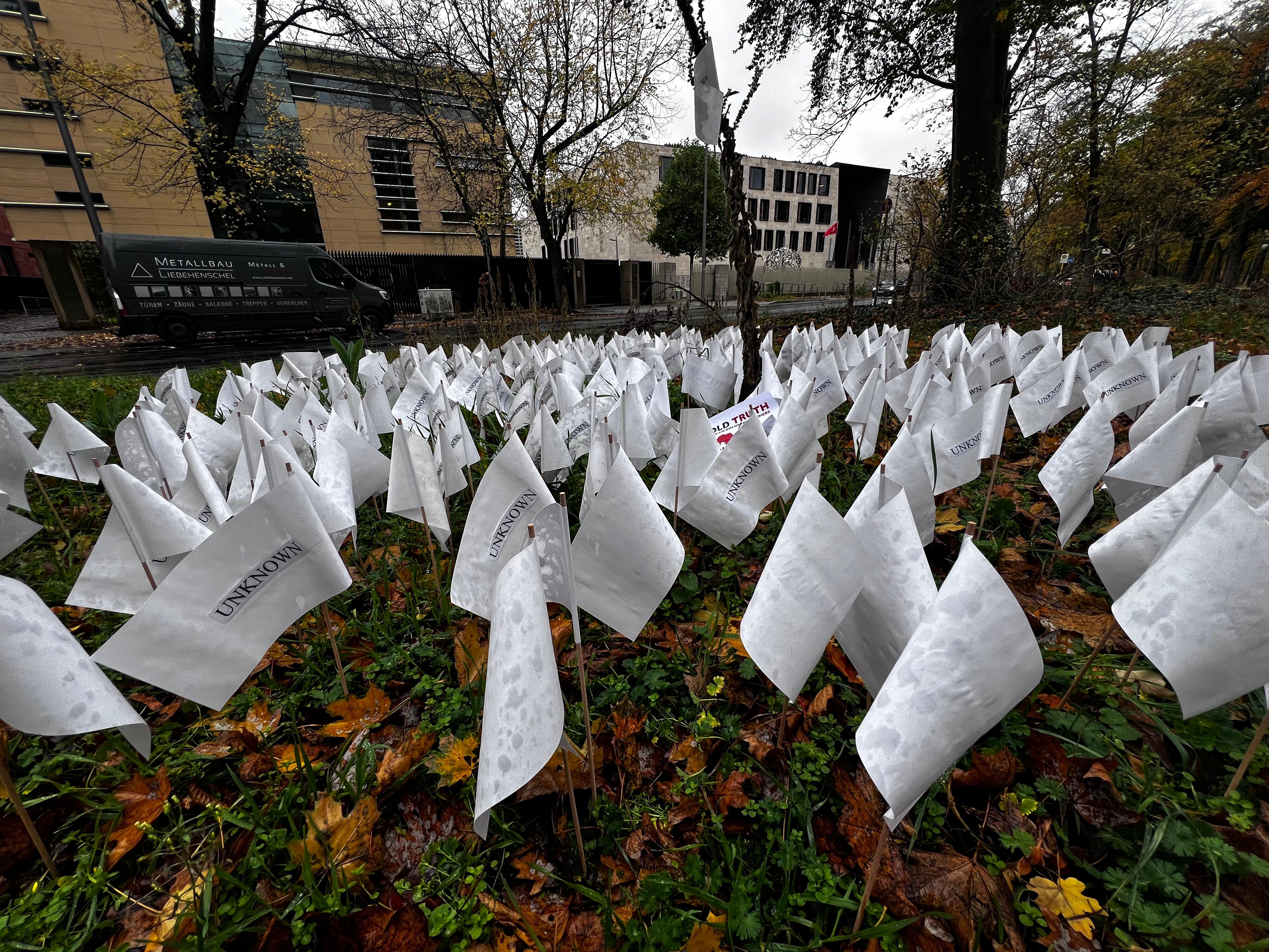 We started with some disagreements with the German police due to the fact that we were not allowed to install our memorial white flag on the ground as it was planned for the DemoExhibit. Our communication with the police ended with the restrictions of not installing the flags but we agreed on the terms that we should display them on the stairs next to the Victory Column/Groβe Stern.